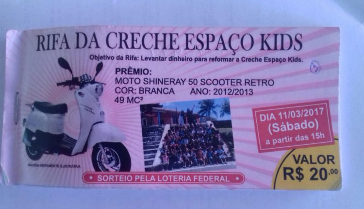 Lembrando que dia 11 de marA�o ( sA?bado) apartir das 15hs, terA? o sorteio da “A� Rifa da Creche EspaA�o Kids ” sorteio pela Loteria Federal onde foi colocado uma Moto Shineray 50 scooter retro branca. Todo dinheiro arrecadado serA? para reforma da creche!