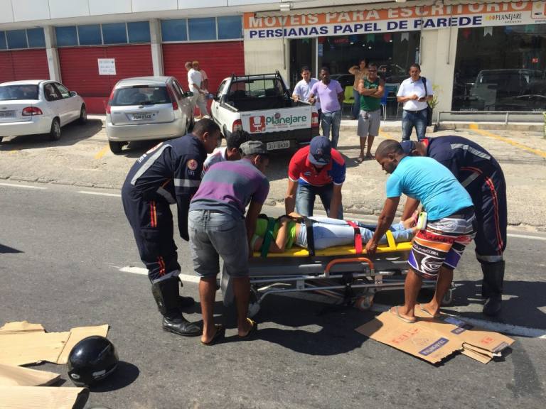 Um acidente envolvendo uma motocicleta e um carro na Estrada do Coco, prA?ximo a Caixa EconA?mica Federal, deixou uma mulher ferida na manhA? desta quinta-feira (2). A vA�tima, que estava na carona da moto, foi atendida por mA�dicos da Samu ainda no local e conduzida com consciA?ncia para o Hospital MenandroA�de Farias.