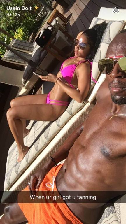 Banhos de sol, de piscina, jantares romA?nticos: cada passo da viagem tem sido registrado por Usain no Snapchat, que nA?o esconde sua admiraA�A?o pela namorada oficial, publicando fotos da bela de biquA�ni e fazendo atA� topless.