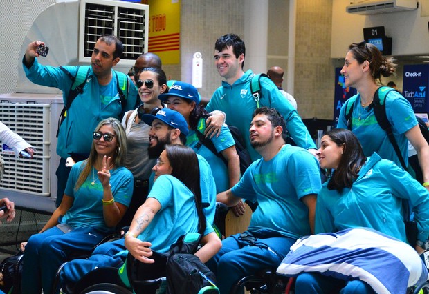 Cleo Pires recebeu atletas paralA�mpicos no aeroporto Santos Dumont, no Rio de Janeiro, na manhA? desta quarta-feira, 31. SimpA?tica, a atriz posou para selfies com os atletas e sorriu para os paparazzi ao ser fotografada no local.