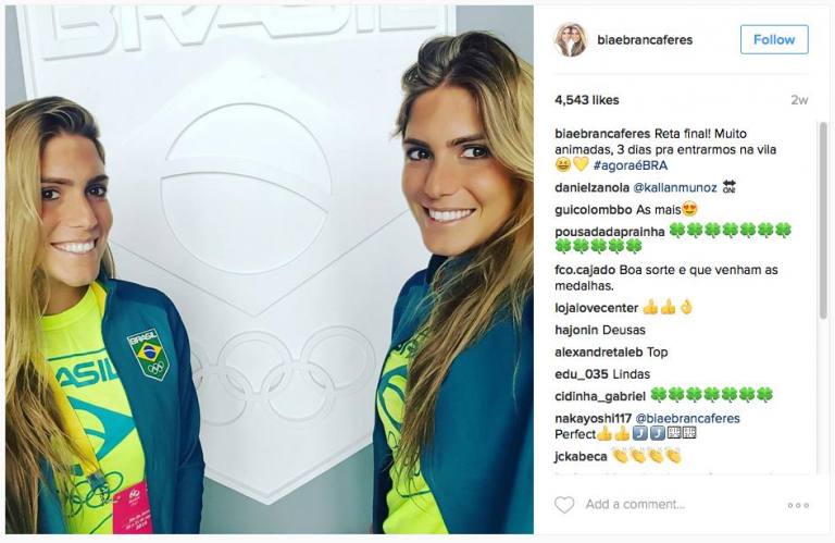 A OlimpA�ada do Rio de Janeiro tem tudo para ser um dos pontos altos da carreira das irmA?s. Para garantir vaga nas OlimpA�adas, Bia e Branca decidiram dar uma pausa em sua carreira artA�stica e focar apenas no esporte desde o comeA�o de 2015. A dupla costuma dividir sua rotina deA� treinamentos no Instagram e recebem muito incentivo dos fA?s. Se depender da torcida,A� Bia e Branca jA? faturaram o ouro em popularidade faz tempo