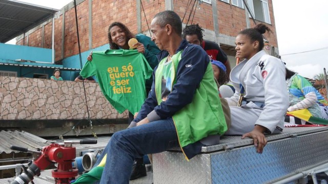 Em cima de um carro do bombeiro, com medalha no peito e bandeira do Brasil, Rafaela foi ovacionada. A sirene e a gritaria na rua assustaram alguns moradores desavisados. De becos e vielas comeA�aram a aparecer olhares curiosos, que se transformaram em sorrisos orgulhosos. Era dia de celebrar uma filha da Cidade de Deus.