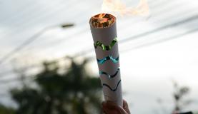 TrA?s meses apA?s chegar ao Brasil, a tocha olA�mpica atravessou a BaA�a de Guanabara de barco na manhA? de hoje (3) e chegou A� capital do estado, onde ocorrerA?o os Jogos OlA�mpicos Rio 2016.