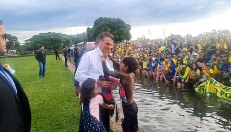 O mandatário recebeu adereços indígenas de uma criança que atravessou o espelho d’água, como um cocar e um colar, e conversou com outro apoiador. Os apoiadores presentes no local também entoaram gritos de guerra, como “Fica, Bolsonaro” e “a nossa bandeira jamais será vermelha”, frase utilizada em antagonismo a Lula e ao PT.