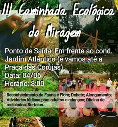 A AssociaA�A?o dos Moradores do Miragem, vem convidar a todos, para participarem da grande Caminhada EcolA?gica que acontecerA? no dia 04 de Junho, a partir das 08:00hs da manhA?.