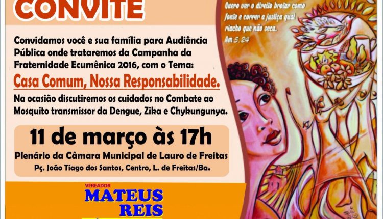 audiA?ncia_campanha_fraternidadePor iniciativa do vereador Mateus Reis (PSDB), a CA?mara Municipal de Lauro de Freitas realizarA? nesta sexta-feira (11), A�s 17h, uma audiA?ncia pA?blica para debater o tema da Campanha da Fraternidade 2016:A�a�?Casa Comum, nossa responsabilidadea�?. A Campanha tem como objetivo debater questA�es ligadas ao saneamento bA?sico e A�s doenA�as transmitidas pelo mosquito Aedes aegypti, como a dengue, zika e chynkungunya.