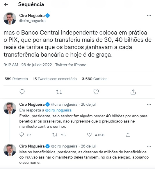 O ministro da Casa Civil, Ciro Nogueira, afirmou nesta terça-feira (26) que banqueiros teriam aderido ao manifesto pela democracia organizado pela Faculdade de Direito da USP (Universidade de São Paulo), porque os bancos perderam R$ 40 bilhões por ano com a criação do Pix, lançado oficialmente no final de 2020.
