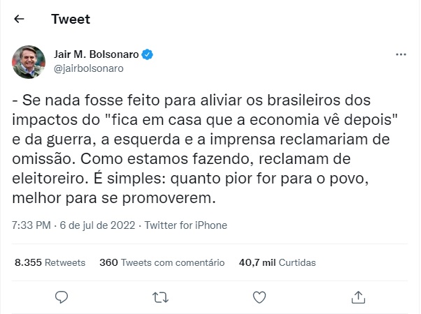 “Se nada fosse feito para aliviar os brasileiros dos impactos do ‘fica em casa que a economia vê depois’ e da guerra, a esquerda e a imprensa reclamariam de omissão. Como estamos fazendo, reclamam de eleitoreiro. É simples: quanto pior for para o povo, melhor para se promoverem”, disse Bolsonaro no Twitter.