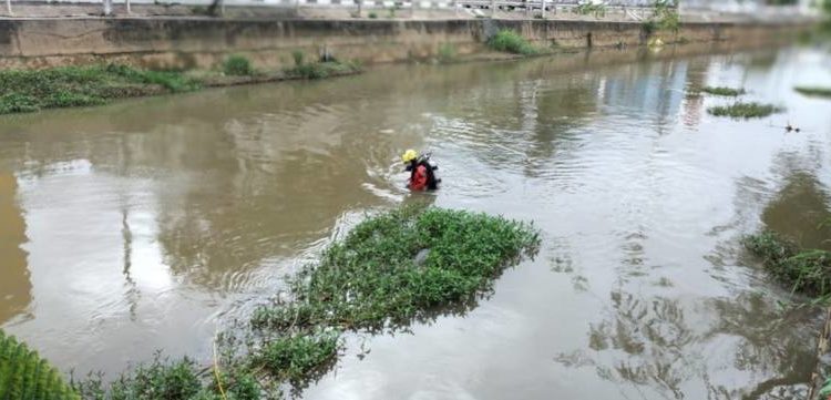 Equipes do Corpo de Bombeiros procuram um homem que desapareceu após entrar em um rio, que corta o centro de Lauro de Freitas, cidade da região metropolitana de Salvador, na tarde de hoje (19).