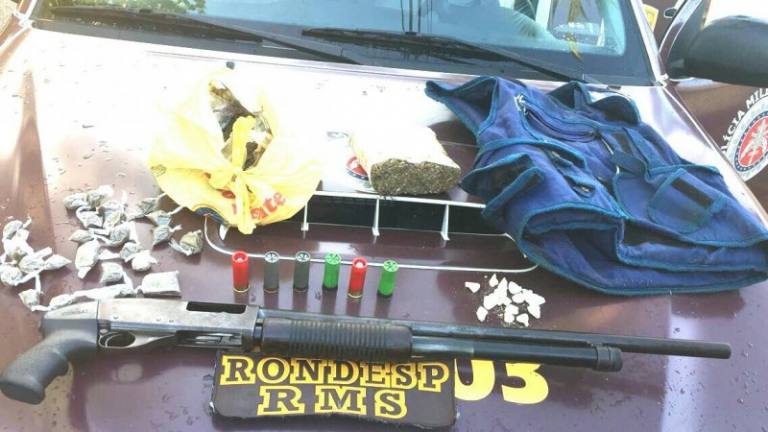 De acordo com a polA�cia, “Tinho” tem passagem pela polA�cia. Na casa onde o suspeito de trA?fico de drogas estava foi encontrada uma espingarda calibre 12, carregada; um carregador de submetralhadora; um colete balA�stico; quantidades nA?o especificadas de cocaA�na, maconha e crack, alA�m dos explosivos desativados pelo Bope. O acusado foi conduzido, juntamente com a arma de fogo e as drogas, para Central de Flagrantes, onde foi autuado em flagrante.