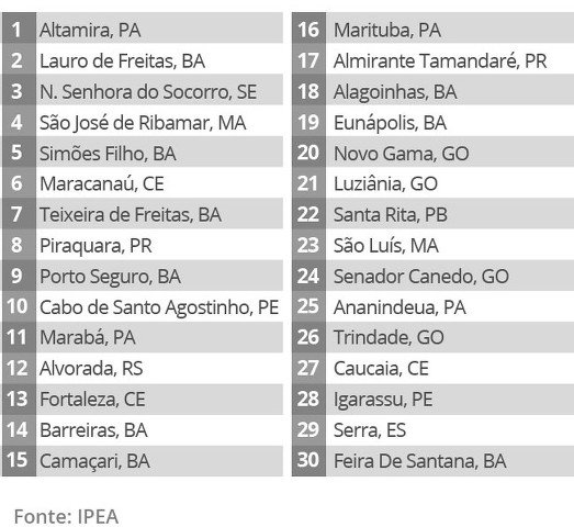 Foram divulgados nesta segunda-feira (05), os dados do Instituto de Pesquisa EconA?mica Aplicada (Ipea) sobre as 30 cidades mais violenta do Brasil com populaA�A?o superior a 100 mil habitantes. CamaA�ari ficou bem no meio da tabela, na 15A? posiA�A?o. A pesquisa A� referente ao ano de 2015.
