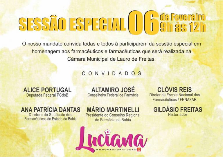 Na prA?xima segunda-feira (6), A�s 9h, a CA?mara de Vereadores de Lauro de Freitas inicia a 14A� Legislatura, anuA?nio de 2017, com uma SessA?o Especial em comemoraA�A?o ao mA?s dos FarmacA?uticos. O dia do profissional de farmA?cia foi celebrado em 20 de janeiro e, para homenagear os profissionais da A?rea, a vereadora Luciana (PCdoB) solicitou ao legislativo a antecipaA�A?o dos trabalhos.