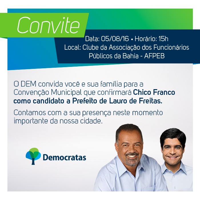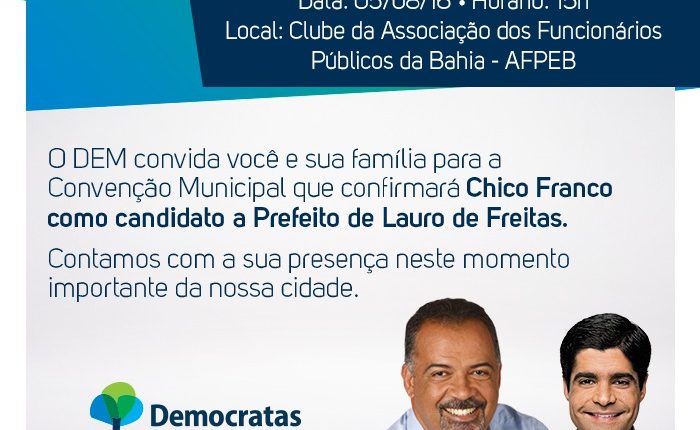 O Partido Democratas realizarA? nesta sexta-feira (5), A�s 15h, a convenA�A?o municipal da legenda, na AssociaA�A?o dos FuncionA?rios PA?blicos da Bahia (AFPEB), em Lauro de Freitas. Na ocasiA?o, o partido confirmada Chico Franco como candidato a Prefeito de Lauro de Freitas.