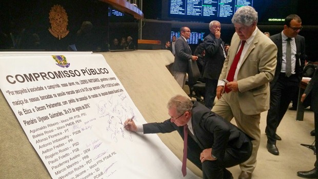 O cartaz foi fixado pelo PSOL e foi assinado, alA�m deste, pelos lA�deres de PT, PSDB, DEM, Rede, PSB, PPS, PCdoB e PDT. Outros deputados tambA�m assinaram o compromisso pA?blico.
