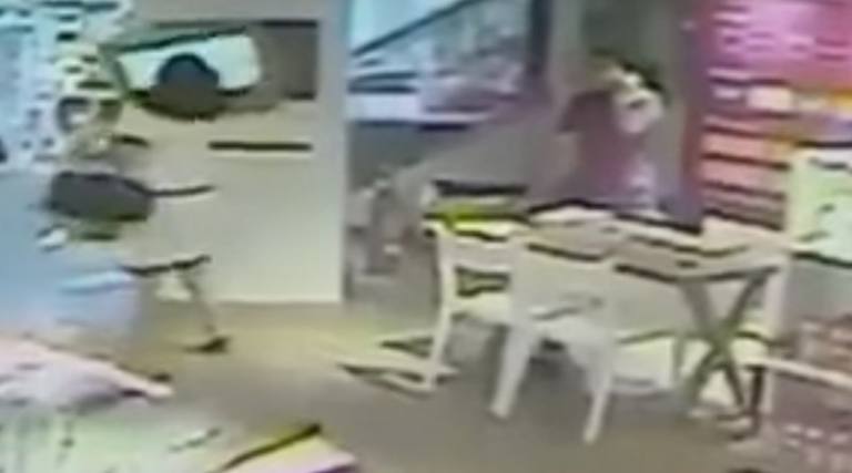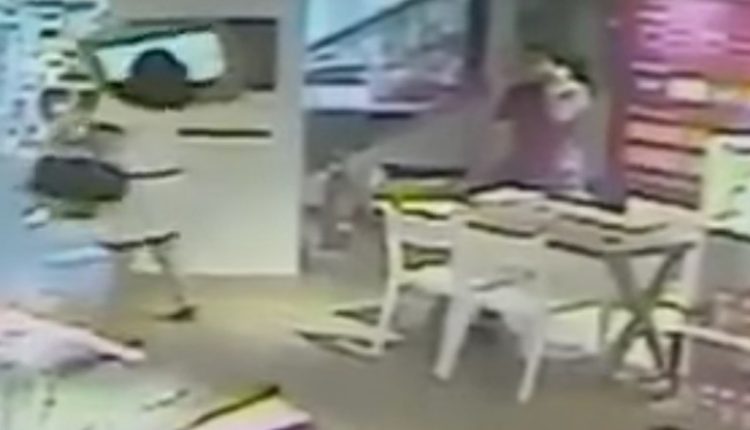 O ataque de fA?ria foi todo captado pelas cA?meras de seguranA�a e divulgado no A?ltimo dia 1A? de fevereiro. Nas imagens, A� possA�vel ver que ela estA? conversando com uma atendente do estabelecimento. Depois disso, a mulher vai em direA�A?o a um monitor instalado na parede e derruba-o no chA?o.