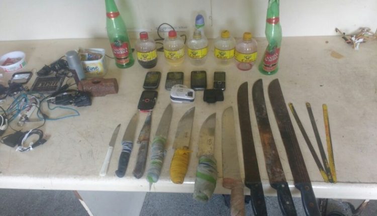 Policiais militares da 36A? Companhia Independente da PolA�cia Militar (CIPM) realizaram uma revista nas celas da 25A? Delegacia Territorial (DT) do municA�pio de Dias Da��A?vila, naA�RegiA?o Metropolitana de Salvador (RMS), nesta segunda-feira (12). Foram apreendidos quatro facA�es, seis facas, trA?s serras, alA�m de garrafas plA?sticas e outros objetos proibidos dentro da carceragem.
