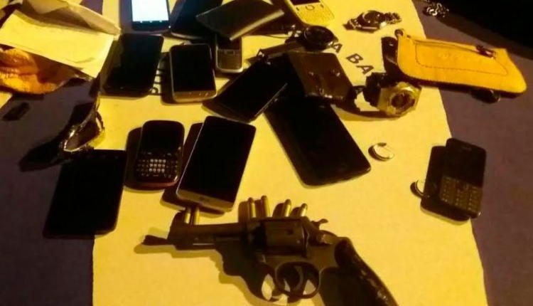 AlA�m dos celulares, os policiais encontraram um revA?lver calibre 38 com eles, alA�m de trA?s correntes de metal, uma pulseira, um porta documentos, uma carteira de cA�dulas, documentos e cartA�es e a quantia de R$ 400,70.