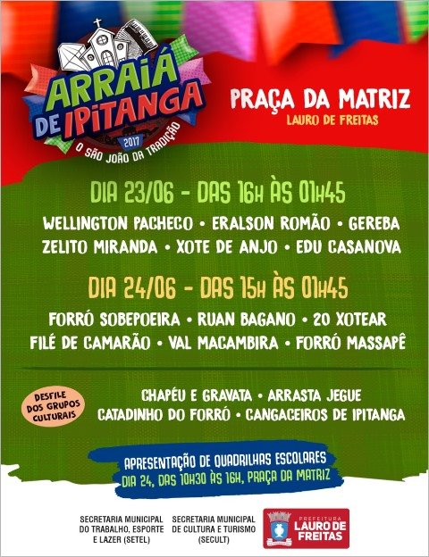 Sanfona, zabumba e pandeiro. A tradiA�A?o do forrA? pA� de serra domina a programaA�A?o do ArraiA? de Ipitanga, em Lauro de Freitas, dias 23 e 24, na PraA�a da Matriz. a�?Manter a tradiA�A?o do forrA? autA?ntico, privilegiar as atraA�A�es locais, A� a nossa proposta, sem deixar de trazer nomes que sA?o referA?ncia na mA?sica nordestinaa�? destaca o secretA?rio de Cultura e Turismo, Manoel Carlos dos Santos.