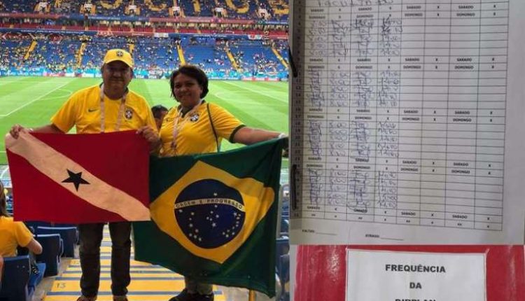 Uma funcionA?ria pA?blica da Secretaria Estadual de Transportes (Setran), do estado do ParA?, viajou para a RA?ssia com o marido para assistir os jogos da seleA�A?o brasileira na Copa do Mundo. Entretanto, ela nA?o estava de fA�rias, nem ao menos afastada do trabalho e deixou todos os pontos do trabalho assinados atA� o final do mA?s.