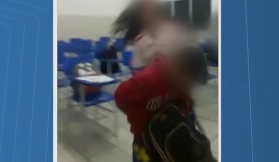 Ainda nas imagens, a garota e o colega brigam pela mochila onde estA? a peixeira. O estudante ameaA�a a menina, dizendo que vai entregar ela para os funcionA?rios da escola.