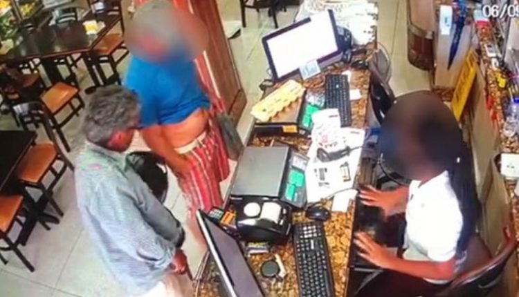 No vA�deo A� possA�vel ver o momento em que o suspeito, que se passava por cliente, anuncia o assalto para uma funcionA?ria. ApA?s mostrar um objeto que aparenta ser uma arma, o idoso recolhe todo o dinheiro do caixa e ainda leva os pertences de uma cliente que estava no estabelecimento.