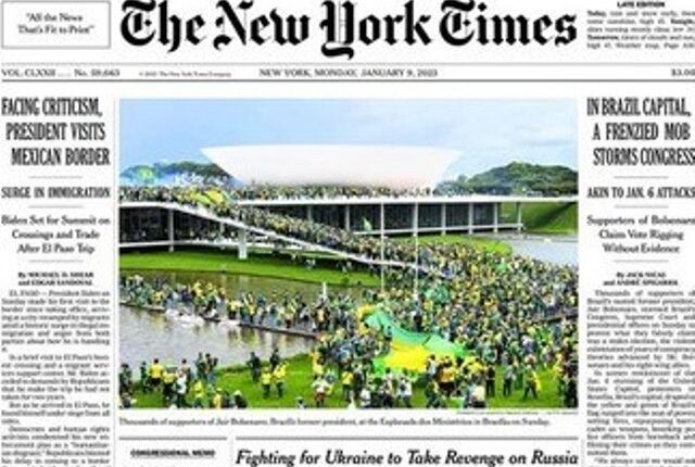 Diversos jornais internacionais, como o New York Times, dos EUA, destacaram na capa de sua edição desta segunda-feira (9) as manifestações ocorridas no prédio do STF, no Congresso e no Palácio do Planalto, em Brasília, no último domingo (8). Veja a repercussão da invasão ao redor do mundo