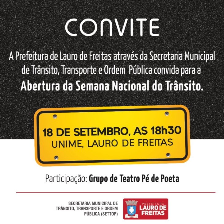 Entre os dias 18 e 25 de setembro, o paA�s inteiro comemora a Semana Nacional de TrA?nsito, e pensando nesta importante ocasiA?o, a Prefeitura de Lauro de Freitas organizou uma programaA�A?o com vA?rias atividades educativas e de conscientizaA�A?o.A�Na programaA�A?o, estA?o o Dia Mundial Sem Carro e blitz educativa em semA?foros da Estrada do Coco, estacionamento do Hospital Aeroporto, entrada de Vilas do AtlA?ntico e outros locais.