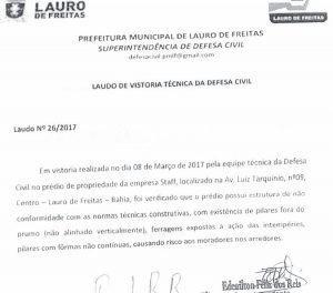 Um prédio localizado na Avenida Luiz Tarquinio, no Centro de Lauro de Freitas, corre grandes riscos de desabar com as fortes chuvas que atingem a cidade desde a última terça-feira (27). O imóvel já foi condenado pela defesa civil em março de 2017, conforme laudo de vistoria técnica.