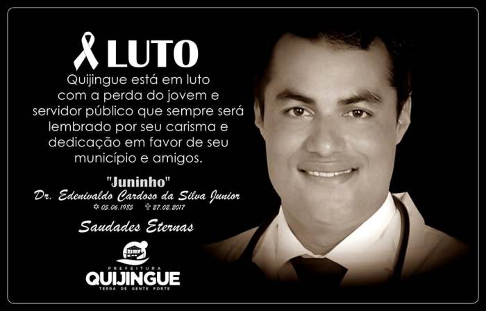O prefeito de Quijingue, Nininho Gois, decretou luto oficial de trA?s dias pela morte do mA�dico Edenivaldo Cardoso da Silva Junior, popularmente conhecido como Juninho, vA�tima de um acidente de carro neste domingo (26).