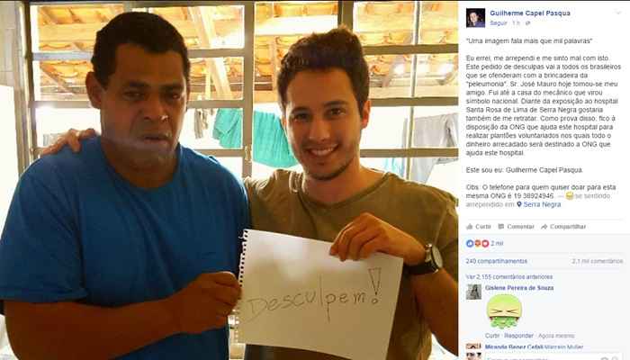 “Eu errei, me arrependi e me sinto mal com isto. Este pedido de desculpas vai a todos os brasileiros que se ofenderam com a brincadeira da ‘peleumonia’. Sr. JosA� Mauro hoje tornou-se meu amigo. Fui atA� a casa do mecA?nico que virou sA�mbolo nacional”, escreveu o mA�dico.