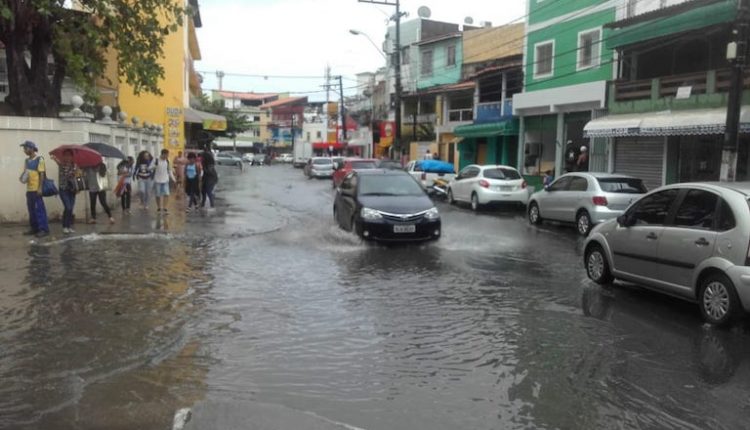 Meia hora de chuva enche cA?rregos e alaga ruas em Lauro de Freitas