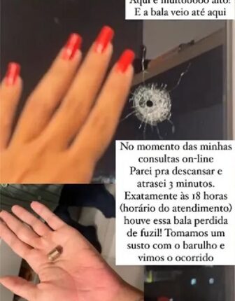 “Olha o que acabou de acontecer aqui, esse é o lugar que eu atendo. Exatamente no momento dos meus atendimentos online. No momento em que eu estava na varanda, a gente ouviu o pipoco e saímos para ver o que era, achamos que não era nada. Eu ia começar a consulta, quando eu vi que estava o vidro todo estraçalhado. Foi um baita susto”.