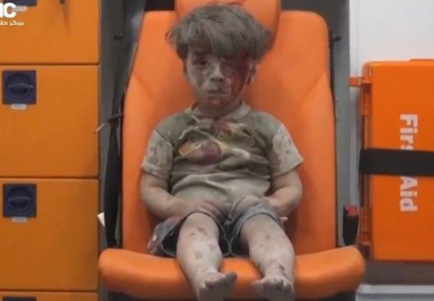 Em um vA�deo filmado pela rede de militantes do Centro de Meios de ComunicaA�A?o de Aleppo (AMC), o pequeno Omran aparece limpando seu rosto ensanguentado com a mA?o. Depois olha para sua mA?o e, sem acreditar, limpa-a em seu assento.