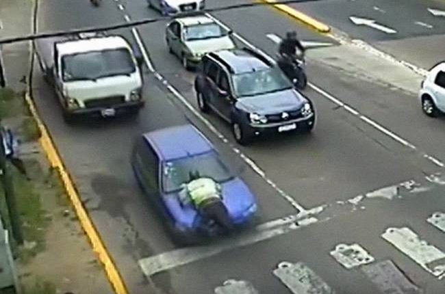 Uma mulher de 61 anos tentou fugir se safar das autoridades apA?s sofrer um acidente de carro na Argentina. A idosa se recusou a entregar a documentaA�A?o do carro, atropelou o agente de trA?nsito e fugiu com ele em cima do capA? por 400 metros.