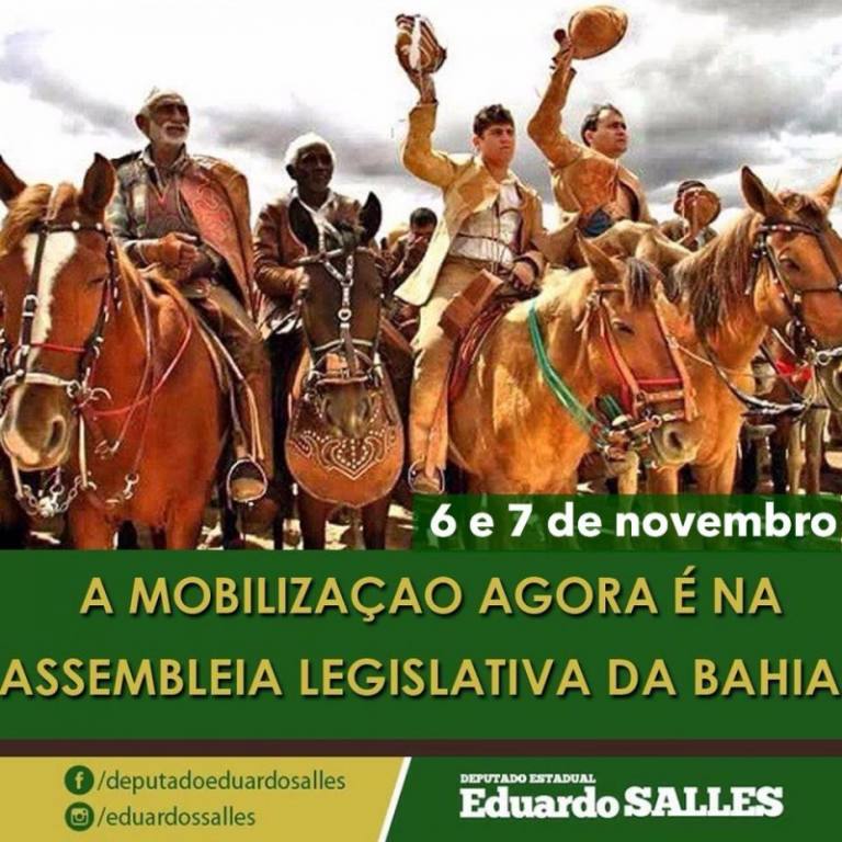 A�a�?Domingo vamos ter um movimento nosso, ordeiro e programado, de toda a famA�lia do cavalo da Bahia, de quem ama a vaquejada, cavalgada e todos os esportes equestres. Vamos nos concentrar no CAB pela manhA?. Convidamos todos os deputados federais, senadores e parlamentares que defendem A� causaa�?, explicou o deputado Eduardo Sales, que propA?s a SessA?o na Casa e lidera o movimento.