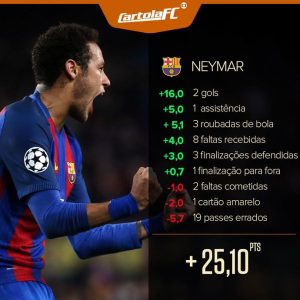 Neymar foi o principal destaque da partida. O brasileiro chamou a responsabilidade nos minutos finais e definiu o jogo com dois gols e uma assistA?ncia.