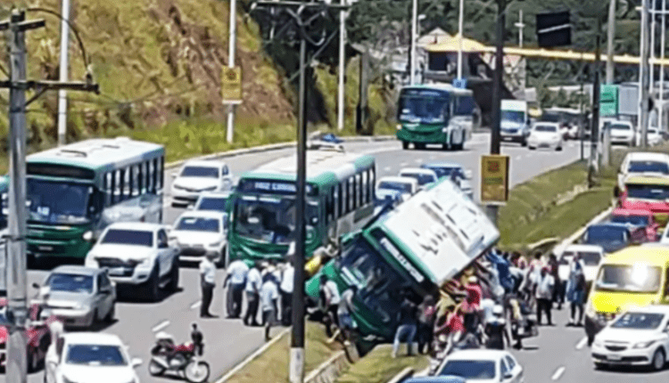 Um ônibus da empresa Ottrans tombou próximo à estação de metrô do Imbuí, na Avenida Paralela, em Salvador, na manhã desta segunda-feira (17). O acidente ocorreu por volta das 10h30, após o motorista sofrer mau súbito e perder a direção do veículo. Com o incidente, parte da pista ficou interditada, deixando o trânsito congestionado no sentido aeroporto.