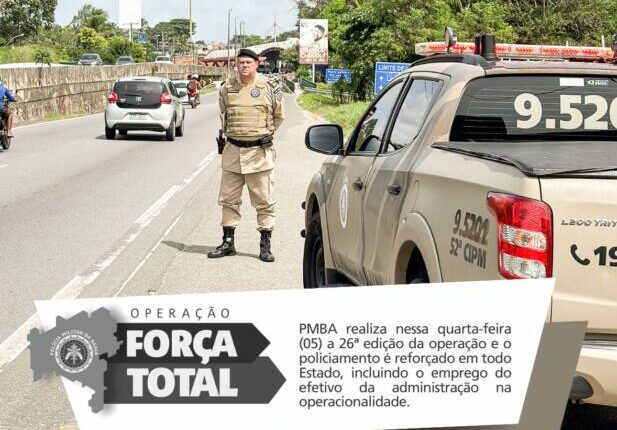 Nesta quarta-feira (5), a Polícia Militar da Bahia realiza a 26ª edição da Operação Força Total em todo o território baiano. Com a proximidade dos festejos juninos, que já ocorrem em diversas cidades do interior, a operação amplia as abordagens e reforça o policiamento preventivo.