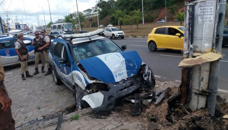 A viatura 9.1517 da PolA�cia Militar da Bahia se envolveu em um acidente na manhA? deste domingo (12) na avenida Santos Dumont, Km 1,5, prA?ximo ao Hospital Aeroporto, na Estrada do Coco, sentido Litoral Norte. O fato aconteceu durante perseguiA�A?o policial.