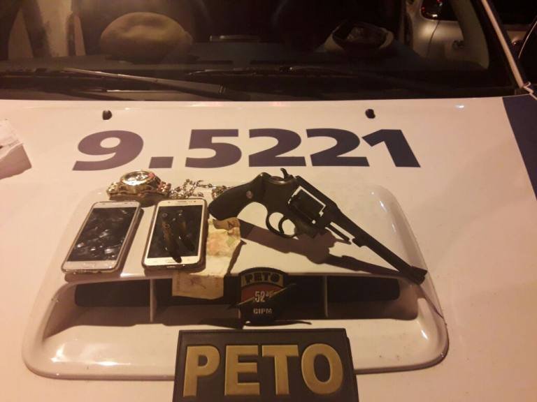 O condutor do veA�culo, que nA?o teve o nome identificado, foi preso. Com ele, os policiais encontraram um revA?lver calibre 38, trA?s muniA�A�es intactas, duas correntes douradas,um relA?gio dourado,dois aparelhos celulares e 20 reais em dinheiro. O acusado e o material apreendido foram apresentados na 34A? delegacia.