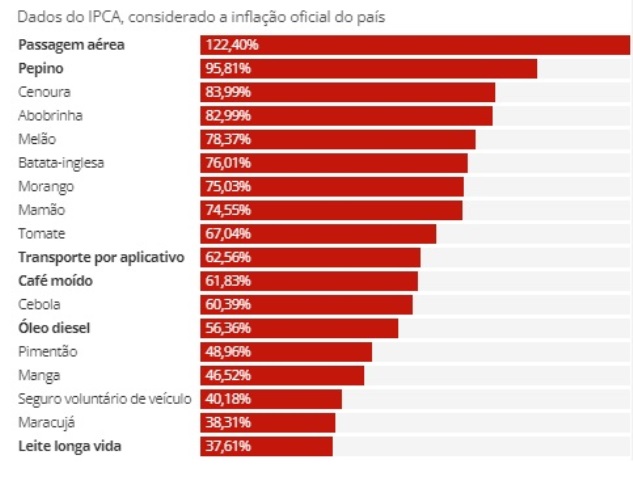 A passagem aérea assumiu a liderança entre os itens que mais subiram, acumulando um salto de 122,40%, seguida pelo pepino (95,81%) e pela cenoura (83,99%).