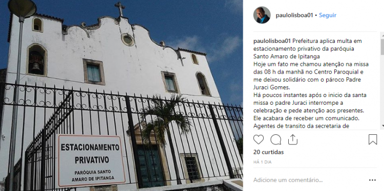 “Em tom de tristeza e indignação o padre pediu para quem estacionou nestas imediações corressem lá para retirar seus veículos e tentar se livrar das penalidades aplicadas. O padre ainda falou que reiteradas vezes já explicou que na frente da igreja existe um passeio amplo e que lá existe uma placa com os dizeres “estacionamento privativo” indicando que neste local pertence à igreja e só ela tem o direito de decidir se pode estacionar ou não”, publicou Paulo Lisboa em seu perfil do Instagram.
