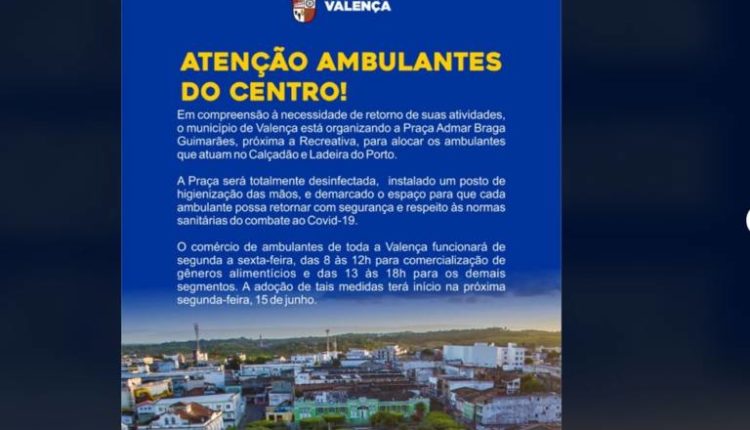 A prefeitura de Valença, cidade no baixo-sul da Bahia, informou, nesta sexta-feira (12), que fará a reabertura do comércio ambulante a partir de segunda-feira (15).