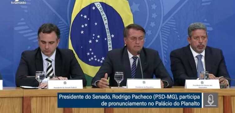 “Em se aprovando no Senado o projeto de lei complementar e em se promulgando, de forma bastante rápida, uma emenda à constituição, isso se faria valer imediatamente na ponta da linha para os consumidores essa diminuição de carga tributária para enfrentarmos esse problema de fora do Brasil, que tem reflexo para todos nós aqui dentro”, disse Jair Bolsonaro.