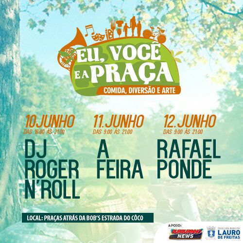 Inspirado pela tendA?ncia mundial de ocupaA�A?o dos espaA�os pA?blicos, o projeto a�?Eu, vocA? e a praA�aa�? levarA?, mensalmente, comida, diversA?o e arte A�s praA�as de Lauro de Freitas. Nos dias 10, 11 e 12 de junho o projeto terA? sua primeira ediA�A?o na PraA�a da SEPLAN (atrA?s do Bob’s da Estrada do Coco), com feira de artes e artesanatos, comida de rua, shows, aulA?o de ginA?stica, brinquedos infantis, artistas de rua e a garantia de um dia prazeroso na praA�a.