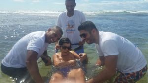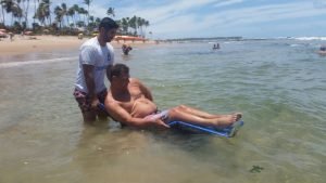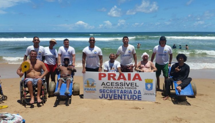 Em Lauro de Freitas estA?o disponA�veis trA?s cadeiras anfA�bias e 30 metros de esteira que possibilitam o banho de mar sem dificuldades. Os portadores de necessidades especiais sA?o auxiliados por estudantes universitA?rios, fruto de uma parceria com a Faculdade MaurA�cio de Nassau.