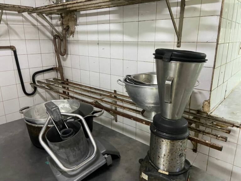 Problemas com infiltração e rachaduras, equipamentos danificados, presença de material em desuso, além do mal acondicionamento de alimentos.