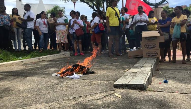 Servidores municipais queimam fardamentos velhos em protesto contra a prefeitura de Lauro de Freitas