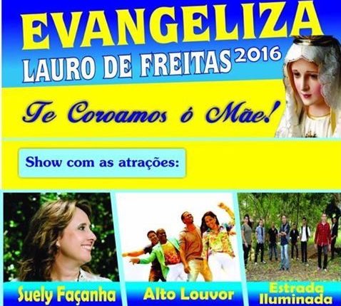 Com a proposta de evangelizar, atravA�s de shows, momentos de oraA�A?o, adoraA�A?o e louvor, a 7A? ediA�A?o do Evangeliza Lauro de Freitas deverA? reunir cerca de 30 mil fiA�is catA?licos. Neste ano, o encontro contarA? com a presenA�a da cantora Suely FaA�anha e as bandas Alto Louvor e Estrada Iluminada. O evento acontece no dia 1A?de maio, A�s 15h, na PraA�a da Matriz, em Lauro de Freitas, e a entrada A� gratuita.
