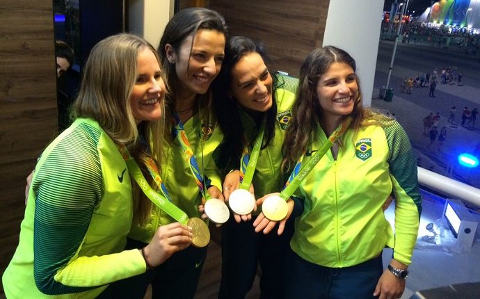 As quatro atletas estiveram no estA?dio para participar ao vivo do Jornal Nacional, assim como da programaA�A?o do SporTV. No intervalo entre um programa e outro, tietaram umas as outras. A?gatha, BA?rbara, Kahena e Martine se abraA�aram com alegria, exibiram orgulhosas as medalhas ganhas nos Jogos do Rio de Janeiro e tambA�m receberam o carinho da torcida, que, de passagem pelo Parque OlA�mpico, gritou o nome de cada uma das medalhistas. Ao lado, Lars e Torben assistiam A� cena com um sorriso de orelha a orelha.